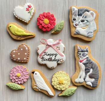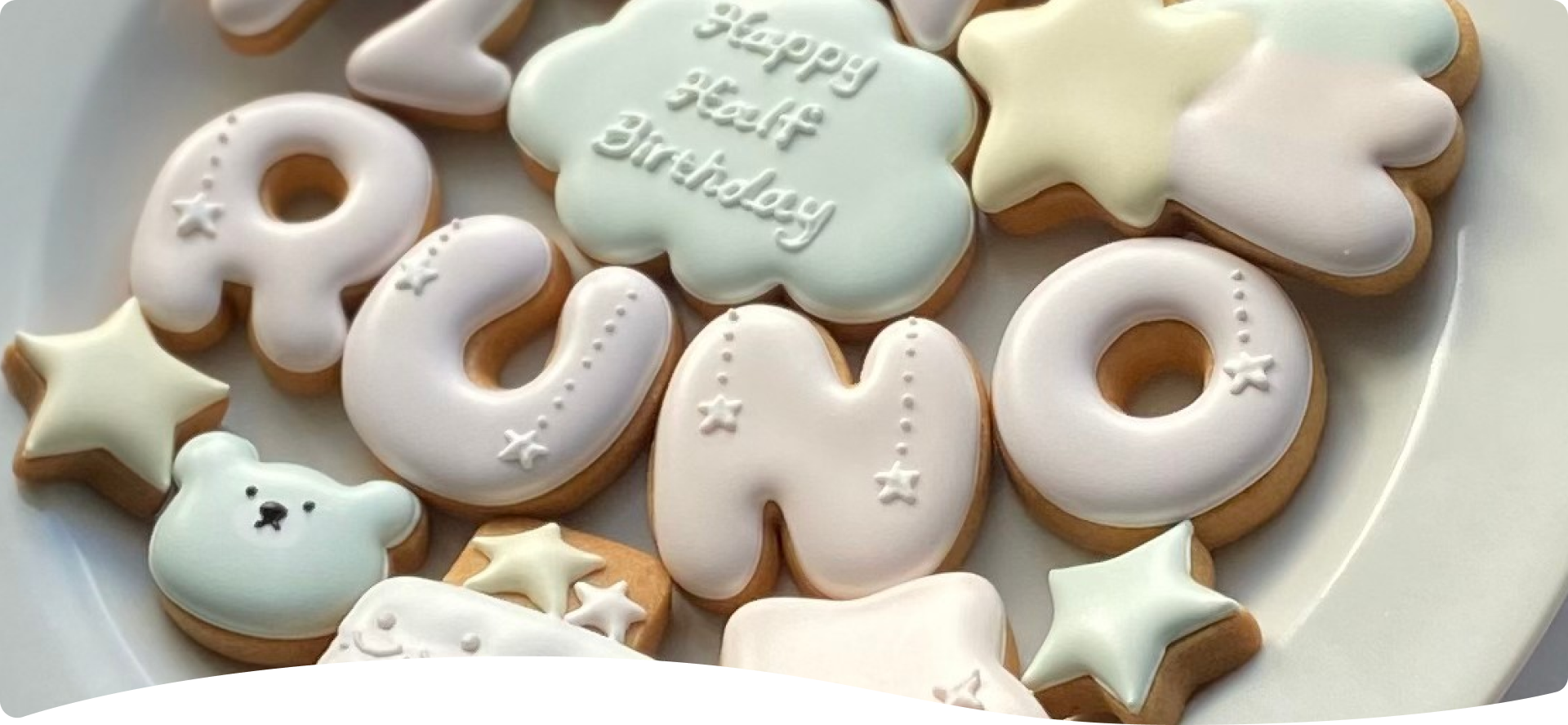 アイシングクッキーとは、クッキーの上にお砂糖のクリームでデコレーションしたお菓子。よく冷たいと思われますが、アイシング=凍らせたように見えることが由来と言われています。 見た目と味の両方を満足していただけるよう心がかけております。全て手作業で生地から一つ一つお作りしています。甘いだけのお砂糖菓子ではございませんので、ぜひバターの香りや食感を楽しみながらご賞味ください。